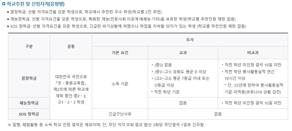 꿈장학금과 재능장학금의 소득기준은 기초생활수급자, 법정차상위계층, 한부모가족지원대상자 중 하나에 해당하면 됨.