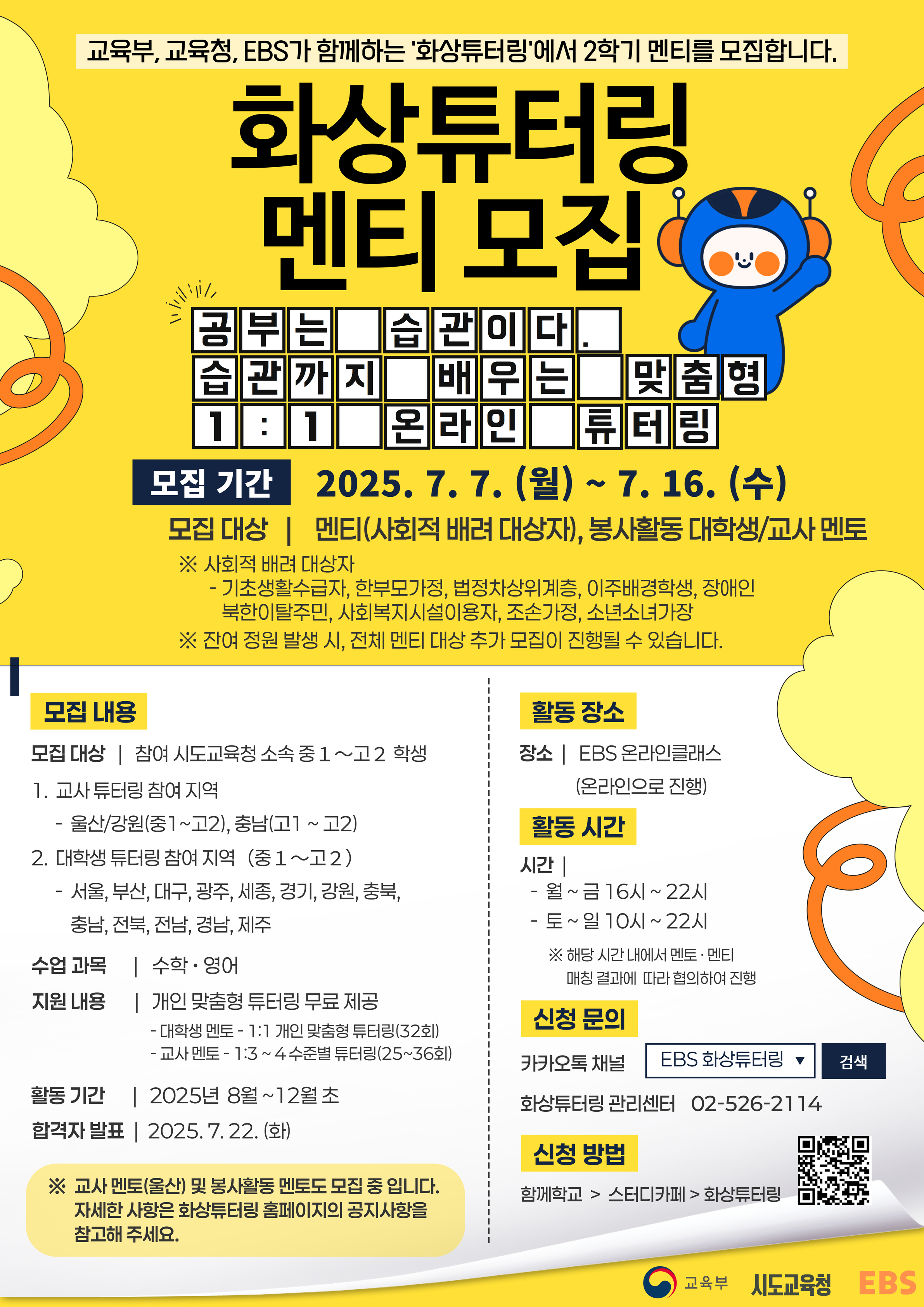 『2025년 EBS 화상튜터링 사업』 2학기 멘티 모집을 안내하오니 관심있는 학생의 많은 신청 바랍니다.
